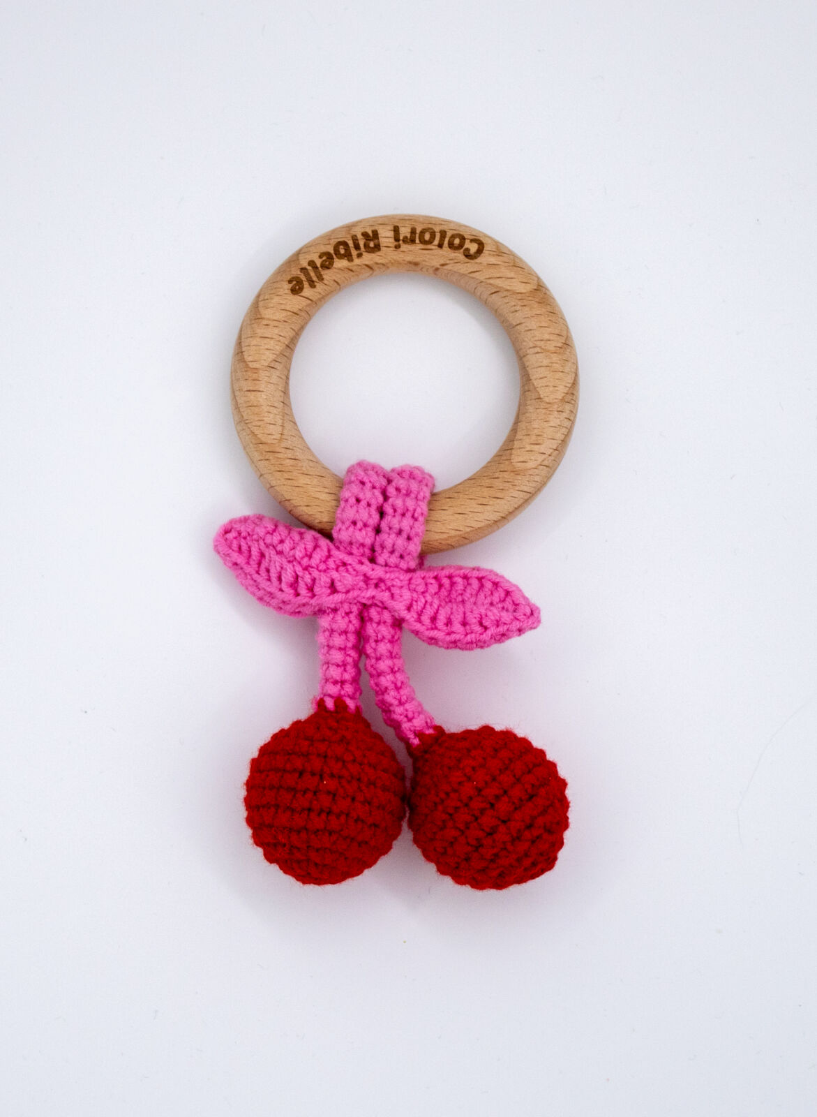 Deze gehaakte kersjes rammelaar (10 cm) is een echte blikvanger in iedere babycollectie. Met zijn speelse uitstraling en zachte afwerking is hij perfect om mee te spelen, vast te houden en neer te leggen als decoratief item in de babykamer.