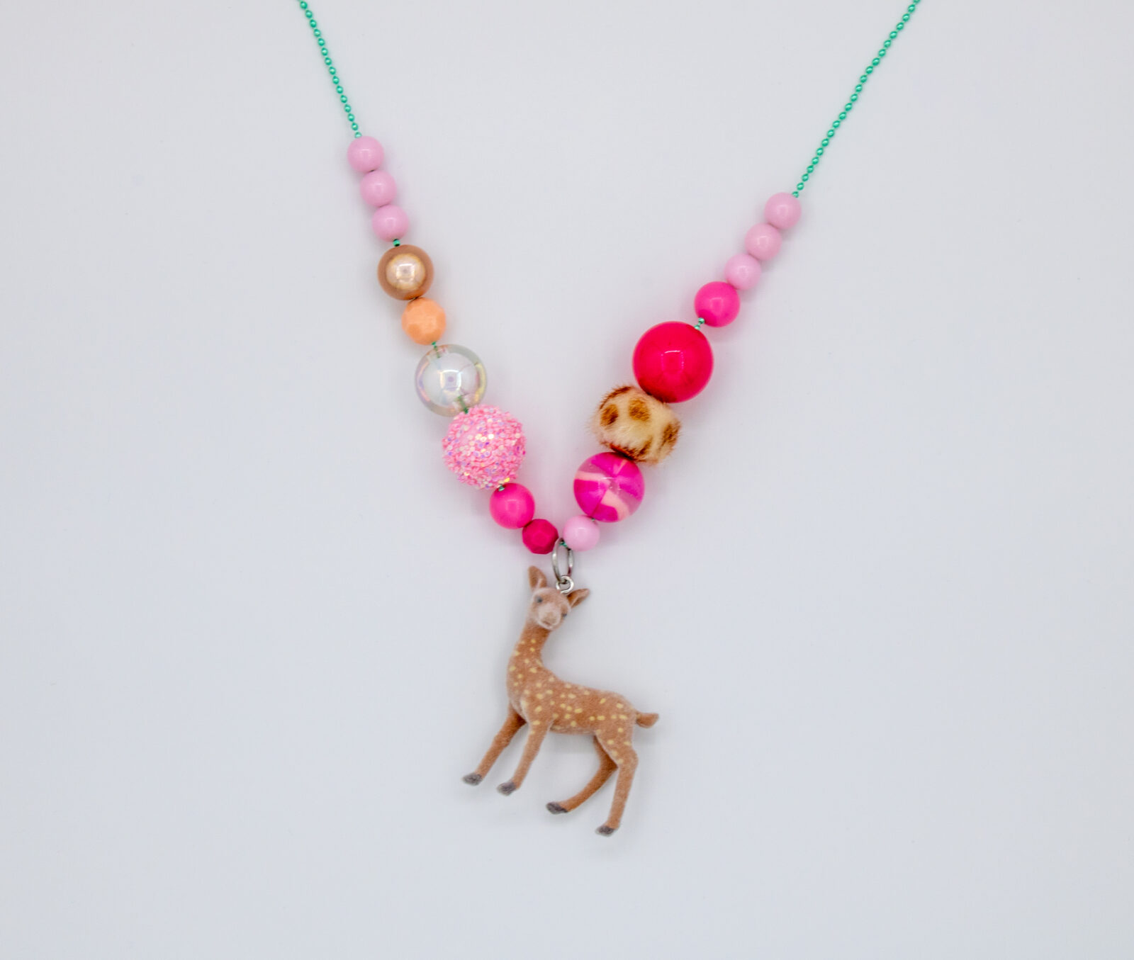 De combinatie van verschillende kralen, zachte tinten en de zachte bambihanger zorgt voor een lieve maar vrolijke uitstraling.