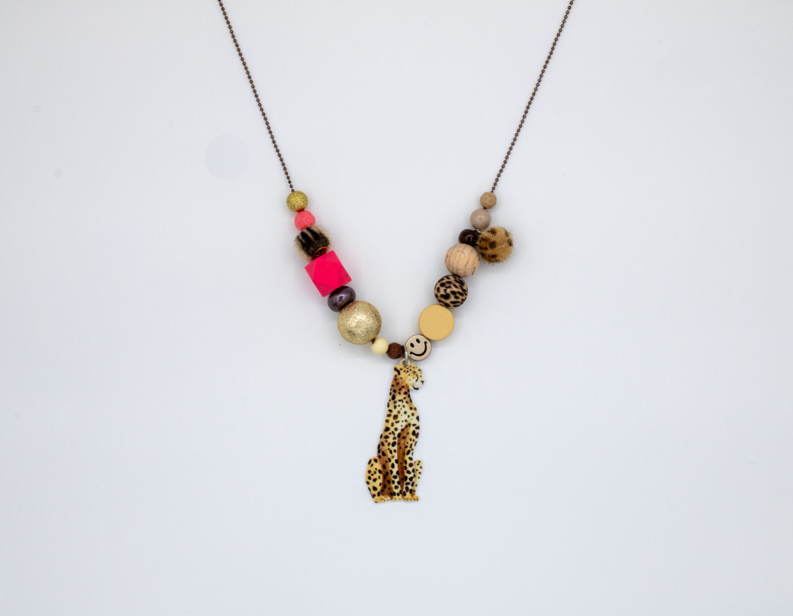 De combinatie van verschillende kralen, zachte tinten en de opvallende luipaardhanger zorgt voor een stoere maar vrolijke uitstraling.