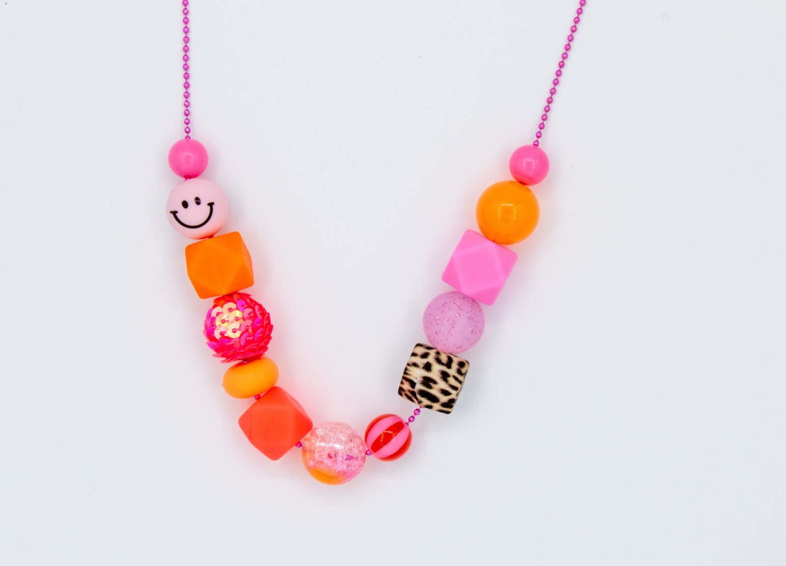 De combinatie van verschillende kralen, knallende kleuren zorgt voor een stoere maar vrolijke uitstraling.