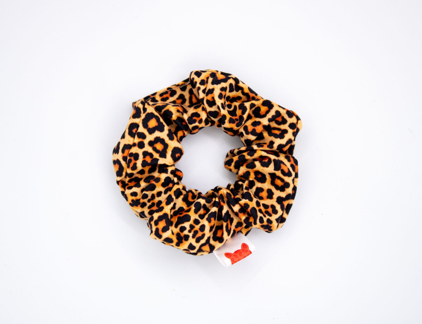 Deze vrolijke zomerse scrunchie combineert een frisse kleur met een stoere, tijdloze print. Het ontwerp is speels maar krachtig en past perfect bij een zomerse look.