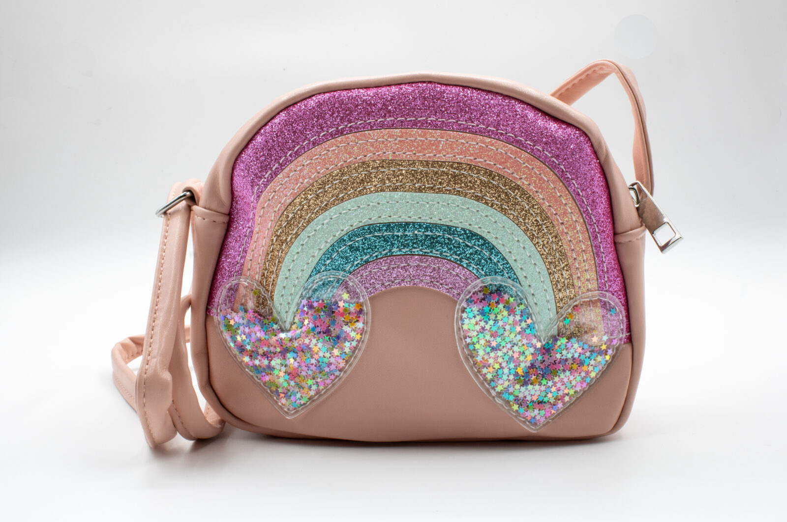 Dit super schattige roze schoudertasje met een regenboog en glitters is een echte musthave voor de kleine meisjes.